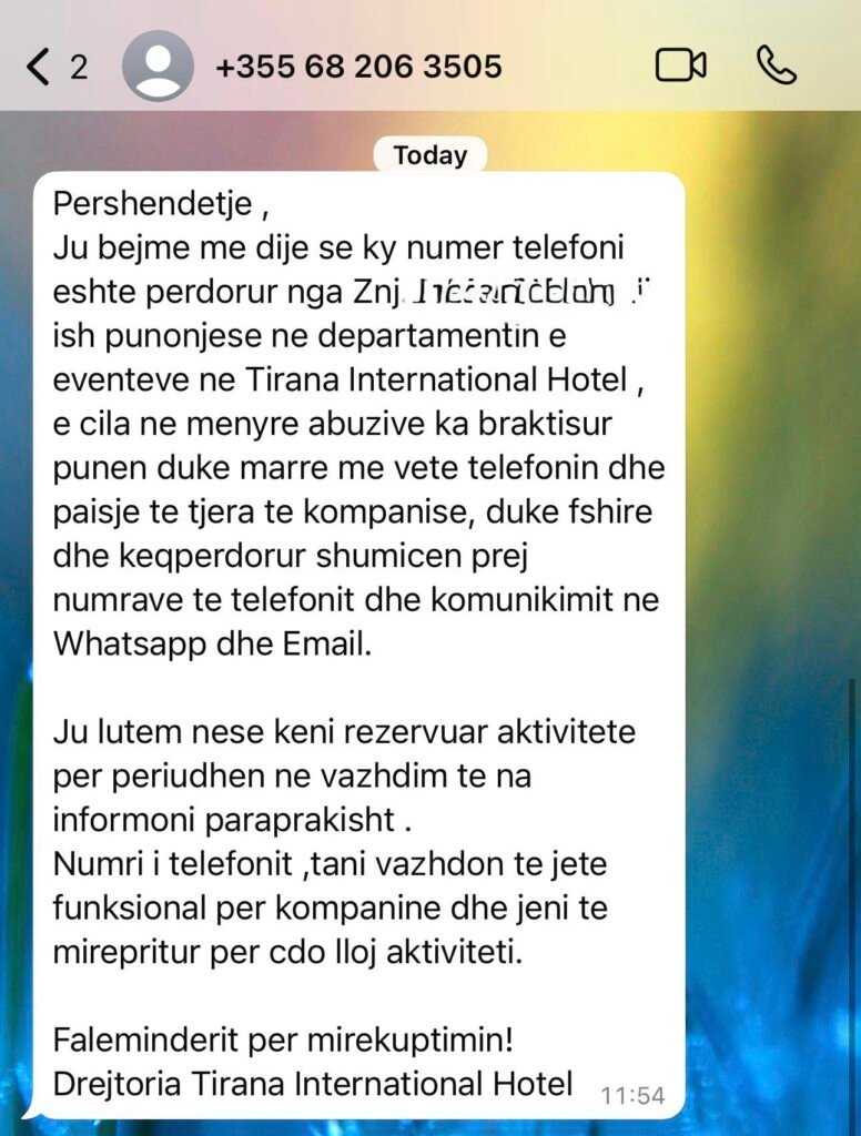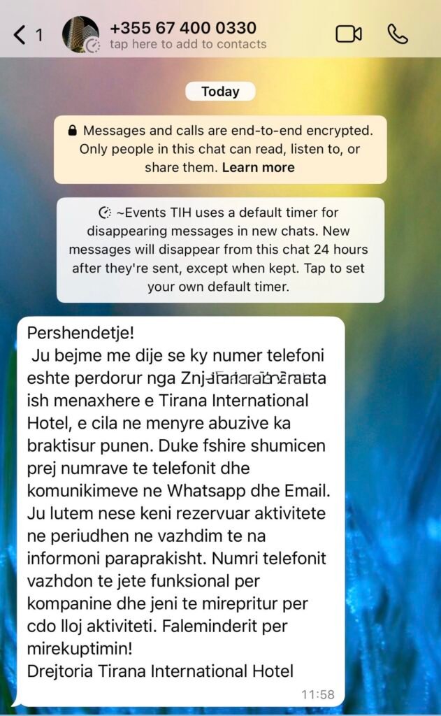 “Ja bashkëpunëtor ndër vite i Tirana International Hotel. Këto janë mesazhe denigruese ndaj stafit me të cilin nga ana jonë ka qenë marrëdhënie korrekte dhe profesionale. Punën dhe karakterin e atyre zonjave të nderuara nuk e venitet një SMS në telefonin tonë.”