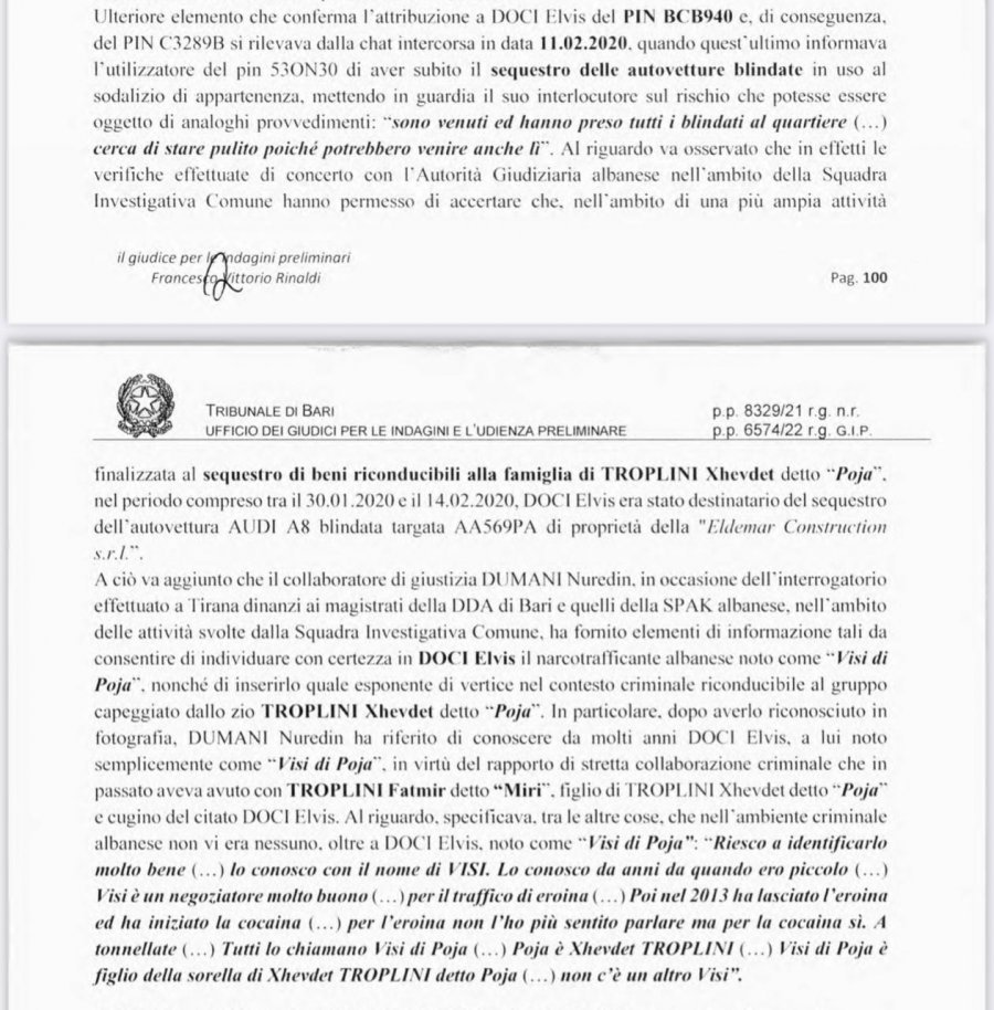 Sipas hetuesve, janë dokumentuar 30 episode të trafikut të drogës në Itali dhe 10 të tjera në Shqipëri dhe vende të tjera të Europës, përmes komunikimeve të dekoduara në platformën Sky ECC, si dhe dëshmive të të penduarve të drejtësisë.
