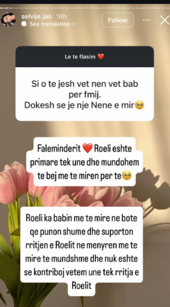 “Roeli ka babin më të mirë në botë, që punon shumë dhe suporton rritjen e tij në mënyrën më të mirë të mundshme”, shkruan Selvija, duke theksuar se nuk është e vetme në përkujdesjen ndaj djalit.